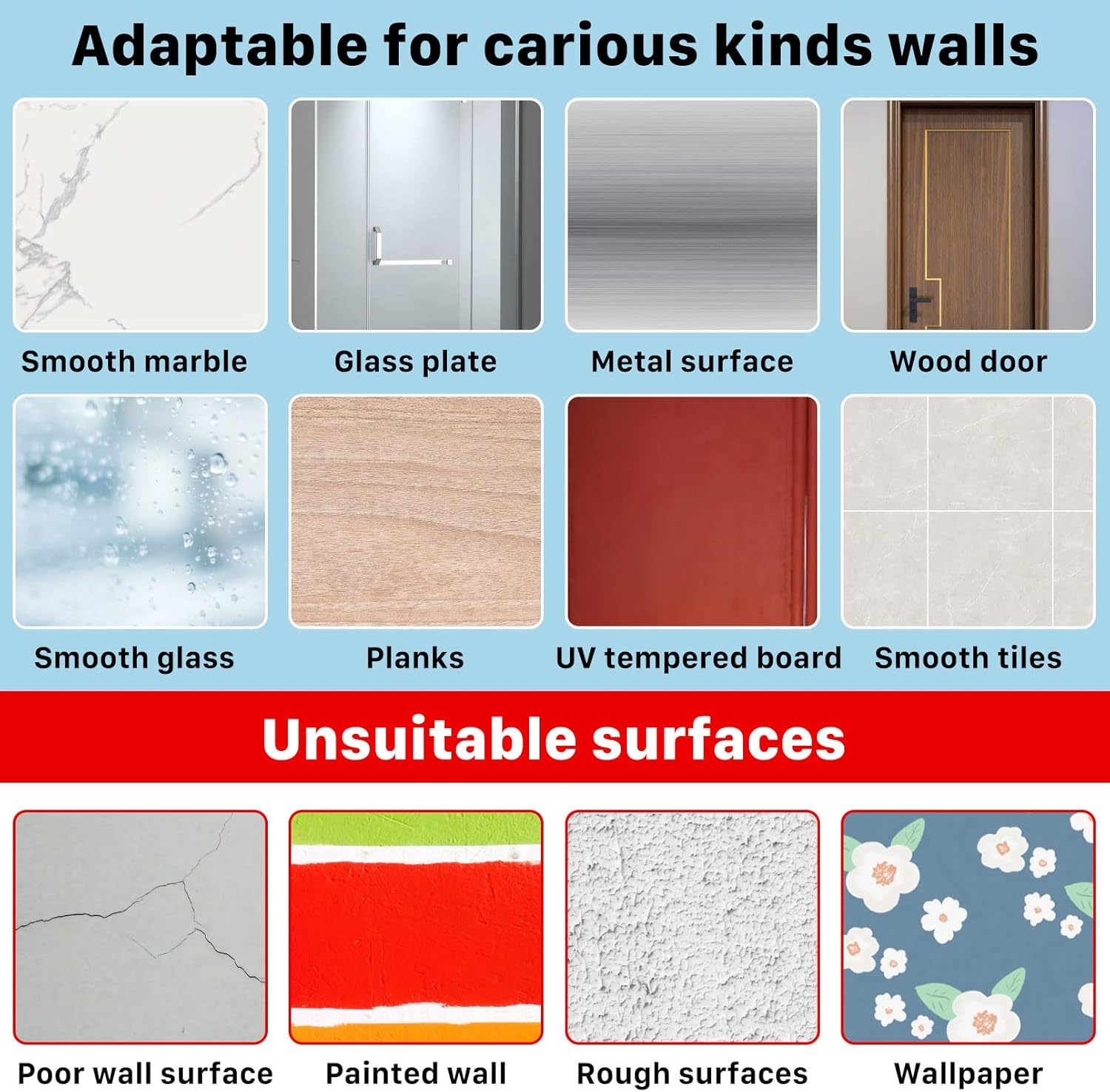 Wall hooks for hanging can be used on a variety of surfaces such as wood, tile, ceramic, metal, plastic surfaces, etc. (please note that there are restrictions on painting walls) not painted and paper walls. It might strip the paint off the walls.